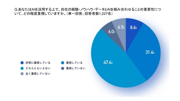 注目すべきは、AI活用にあたり、4割が「自社の経験、ノウハウ、データと組み合わせること」を重視していると回答した点だ。「重視していない」とした回答(12.6%)を大きく上回っており、AIによる競争力強化には「自社の知」の活用が不可欠との認識が広がっていることがうかがえる。