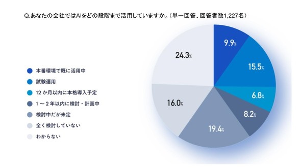 実際に、本番環境でAIを活用している企業は9.9%にとどまった。一方で、「検討中だが未定」(19.4%)、「全く検討していない」(16.0%)は4割近くを占める。導入済みの企業でも、多くは「データ統合、活用」にとどまっており、「品質、リスク管理」や「オペレーション効率化」への展開が今後の課題となっている。