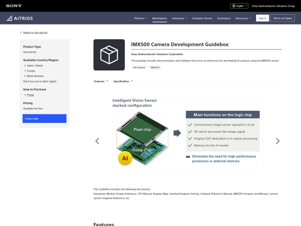 IMX500 Camera Development Guideboxは、IMX500を搭載するエッジAIデバイスの開発に向け、開発者に必要な技術情報/設計資料を網羅したドキュメント集である。初期設計から量産までを効率的に進めるのに役立つ情報として、IMX500センサーのデータシート、ハードウェア設計レファレンス、ソフトウェアレファレンスマニュアル、AIインプリメンテーションガイド、IMX500ファームウェアなどが含まれる。エッジAIセンシングプラットフォーム「AITRIOS」のマーケットプレースに登録した法人ユーザー向けに無償で提供される。