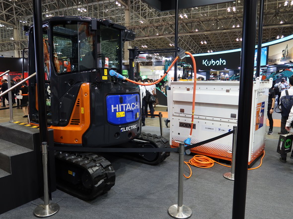 日立建機も、移動式蓄電池に有線接続して充電しながら稼働できる建設機械を提案している。移動式蓄電池は九州電力と共同開発した。通常時は車両本体のバッテリーで駆動して作業し、バッテリー残量が少なくなってきた場合は有線で充電しながら稼働を継続できる。電欠の心配を解消し、電動建機導入のハードルを下げる狙いだ。