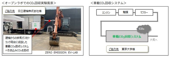フタバ産業と日立建機は、既存のエンジン駆動の建機に後付け可能なCO2回収システムの実証実験を行った。排ガスからCO2を分離、回収する。1日4時間の稼働でCO2排出を12%削減できることを確認した。今後はさらに改良し、建機だけでなくトラックでもCO2回収を検証する。パートナーである東京大学とも協力しながら開発を進めていく。