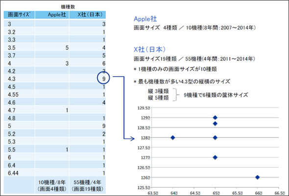 アップルとソニーグループの2014年までのスマートフォン端末の製品仕様数を比較すると、アップルはiPhoneのバリエーション展開を8年間で10機種にとどめている(画面サイズ違いの4種類を含む)。一方、ソニーグループはたった4年間で55機種(画面サイズ違い19種類を含む)もの展開を行っており、半分の期間に5倍以上のバリエーションを市場に投入したことになる(8年間で換算すると10倍だ)。
