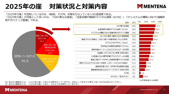 製造現場におけるIoTの活用は、全体から見るとまだまだ少ない状況です。当社が行った独自調査によると、全体の約5%の普及にとどまっています。ただし、企業としてDX(デジタルトランスフォーメーション)の必要性の課題を認識しており、かつ対策を講じている企業群に焦点を絞ると、その企業群の45.5%がIoT機器の導入/活用を推し進めています。このことから、IoTの活用はモノづくりにおけるDXの有力候補である、と言えます。