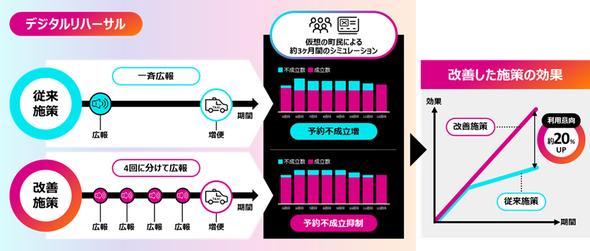 このシミュレーションを活用して、「サービスを認知すること」「有用性を感じること」といった利用意向に強い影響を与えると考えられる2つの心理的要因を重視し、「広報活動」と「台数を増やすサービス拡充」の2つの対策を広報予算と台数を制約条件として最適化した。このシミュレーションでは、予約成立の可否や広報活動の認知度が住民の利用意向にどのように影響するかを見た。その結果、広報時期や配布先、タクシー台数、増車時期の調整により、予約不成立を減少させ、利用意向を約20%向上できることが判明した。
