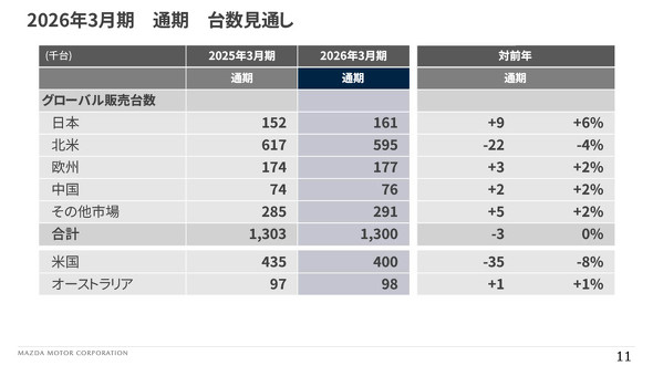2025年度通期のグローバル販売台数は、前年度から3000台減の130万台で前年度並みを目指す。米国は関税の影響が広がり、混乱が続くと予想して同8%減(3.5万台減)の40万台を見込んでいる。その減少を日本、欧州、中国、その他市場でカバーする。生産台数は第1四半期で減少したが、2025年度通期としては第2四半期から第3四半期にかけて増加していく計画だ。