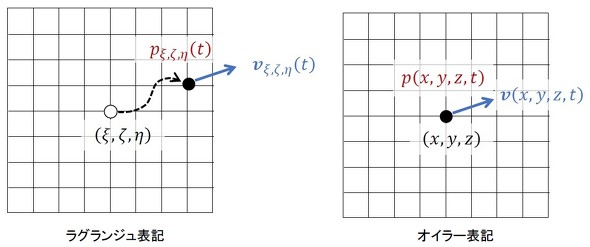 左側のラクランジェ表記は、流体粒子を考えればよいと思います。例えば、t=0[s]の時点で(ξ,ζ,η)にいた流体粒子の、時刻tにおけるx方向変位はx(ξ,ζ,η,t)と表記されます。この(ξ,ζ,η)は、流体粒子の“背番号”(例えるなら野球のユニフォームの番号)のようなものであり、計算が進行しても変わりません。そして、この背番号(ξ,ζ,η)を持つ流体粒子を追い掛けます。背番号(ξ,ζ,η)の流体粒子の、時刻tにおける速度vはvξ,ζ,η(t)と書けるのでしょうか、少し自信がありません。