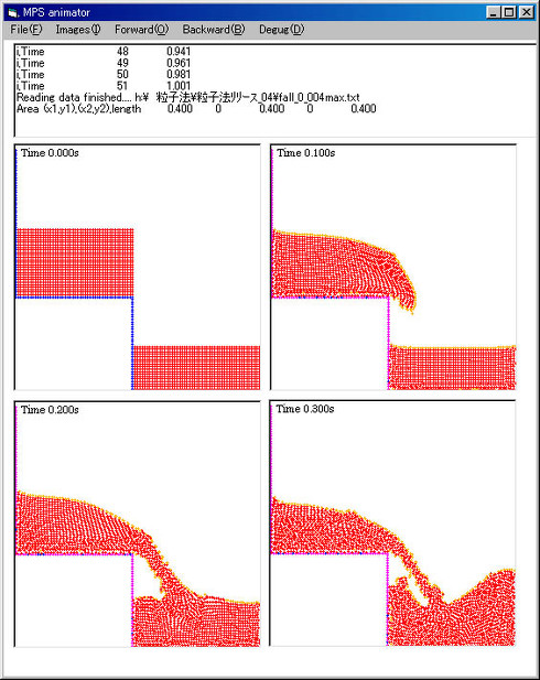 粒子法の利点は、自由表面解析を容易に実施できる点です。現在では有限体積法でも自由表面解析が可能になりましたが、粒子法の方がはるかに簡単に実現できます。表面張力についても、粒子間に引力のような力を発生させることで、シミュレーションに組み込むことが可能です。