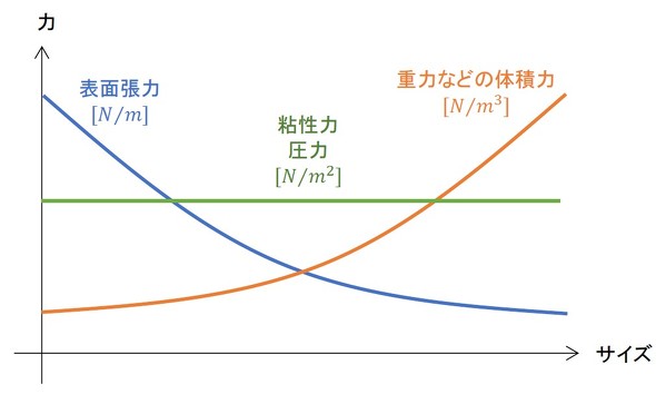 自由表面を持つ流体の挙動について、筆者はサイズによって支配する力が入れ替わると考えています。そのイメージを図19に示します。