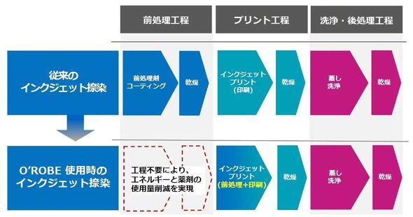 O'ROBEは、この前処理工程を省き、プリントと同時に必要な量の前処理インクを生地上に塗布できる仕組みを採用。これにより薬剤使用量を削減でき、コーティング後の乾燥工程を不要にした。また、前処理をプリント工程に一体化することで、染色加工企業の設備投資や管理コストを抑え、収益性の改善に貢献する。