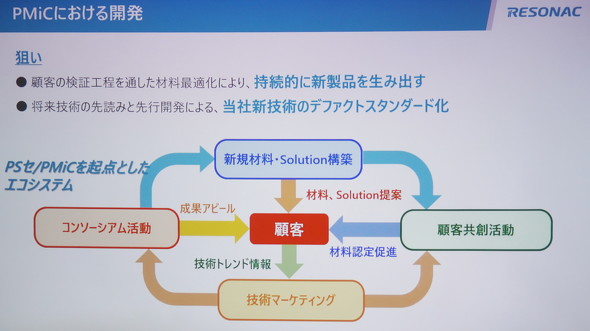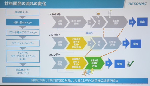 畠山氏は「PMiC設立以前のパワーモジュール向け材料の開発では、研究開発した素材/部材を自社で評価してから顧客に提案していた。その後、顧客の評価を経て、採用が決まった場合は量産化することになるが、もし顧客の評価が悪い場合には、再び研究開発と評価をやり直すという手戻りが発生していた。PMiCの材料開発フローでは、研究開発した素材/部材を、共創パートナーの顧客が求める条件で評価する。続いて、顧客と共同で評価し、採用が確定したら量産化を行う。そのため、従来と比べて手戻りを削減できる」と語った。