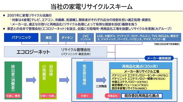 そして、パナソニックグループは東芝との共同出資で管理会社のエコロジーネットを設立し、全国に引き取り場所と再商品化工場を設け、リサイクルを開始した。
