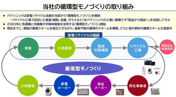 田島氏 パナソニックグループは、家電リサイクル法施行当初から「循環型モノづくり」を模索しており、リサイクル工場で回収した資源(樹脂、金属、ガラスなど)をグループ内の工場に循環させ「商品から商品へ」を目指してきた。洗濯機と冷蔵庫を手解体した樹脂を商品に再利用する循環を2003年に開始した。現在までに、樹脂の循環スキームを進化させながら、基板や鉄の循環スキームを構築し、他の素材の循環スキームも構築を進めている。