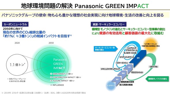 田島氏 また、パナソニックグループでは現在、長期環境ビジョン「Panasonic GREEN IMPACT(パナソニック グリーン インパクト)」を掲げ、「より良いくらし」と「持続可能な地球環境」の両立を目指している。同ビジョンでは、地球環境問題の解決を最重要課題と位置付け、事業活動や提供する商品/サービスを通じて、社会全体のCO2排出量削減に貢献することを目標としている。2050年に向けて、世界におけるCO2総排出量の「約1%(3億トン)」の削減インパクトを目指している他、循環型モノづくりの進化とサーキュラーエコノミー型事業の創出により資源の有効活用と顧客価値の最大化に取り組んでいる。