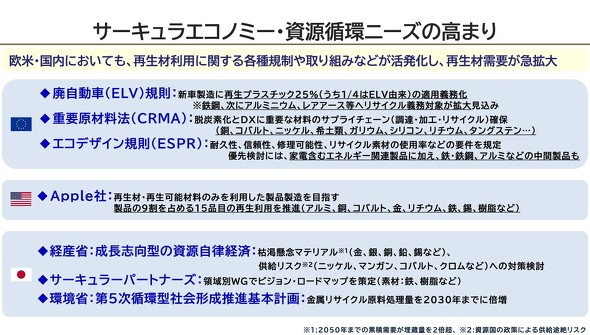 近年、国内外において経済安全保障や環境保護についての観点から金属資源の有効活用がより一層求められている。経済産業省は持続可能な経済成長を実現するために「成長志向型の資源自律経済戦略」を2023年に策定し、資源の効率的な利用とリサイクル促進により、経済発展と環境保護を両立させることを目指す。