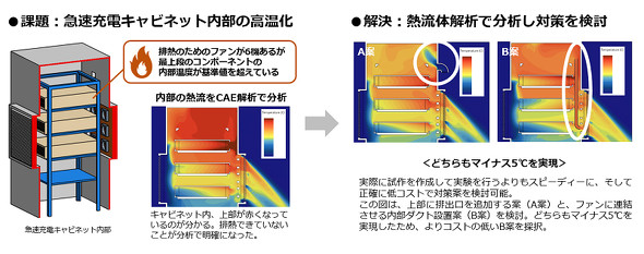 急速充電器の発熱を解決する事例では、CAE解析によって、充電器が格納されているキャビネット内の排熱が十分ではなく、上部に熱がこもっていることが判明した。この結果を踏まえて、シミュレーション上で複数の解決策を検討し、顧客の環境に合わせた最適解を導き出す。