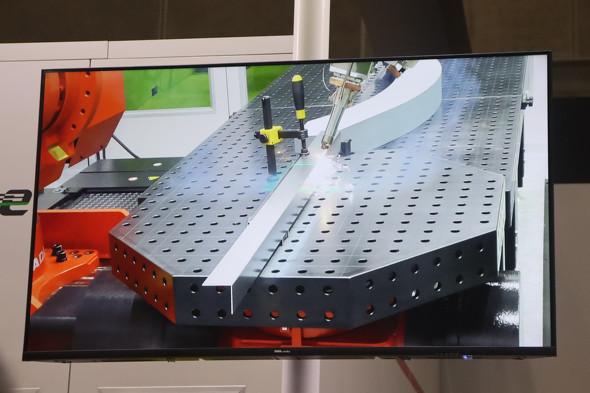 大型のワークでは、溶接中に熱ひずみが生じてワークが変形し、事前にティーチングした箇所と溶接点がずれてしまうケースがある。溶接点のずれを防ぐため、クランプでワークを複数箇所固定することも可能だが、その工数がかかってしまう。
