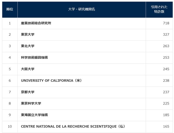 集計対象は、2024年12月までに公開された全ての特許のうち、同年1〜12月末の期間に拒絶理由として引用された特許だ。集計の結果、最も引用された機関が産業技術総合研究所(産総研)で、2位に東京大学、3位に東北大学が続いた。