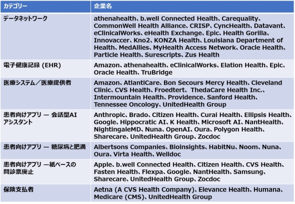 CMSデジタルヘルスエコシステムの発表に先立つ2025年7月23日、ホワイトハウスは同年1月23日にトランプ氏が署名した「アメリカのAIリーダーシップへの障壁除去に関する大統領令」(関連情報)に基づく「AI競争に勝利する:米国AI行動計画」を発表している(関連情報)。この行動計画では、「AIイノベーションの加速」を第1の柱にしているが、CMSデジタルヘルスエコシステムの先進的導入企業をみると、「患者向けアプリ―会話型AIアシスタント」の中にGoogle、Microsoft、OpenAIといった大規模言語モデル(LLM)開発企業が名を連ねている。他のカテゴリーには、Amazon.comやAppleの名前もありビッグテック企業の存在感が増してきた。