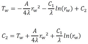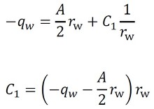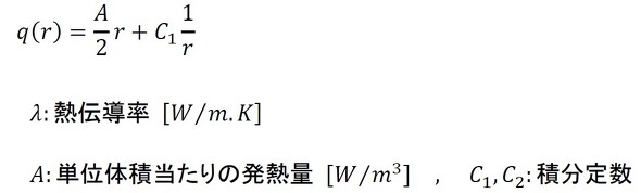 次に、内部流れにおける積分定数を求めましょう。円管内壁の熱流束を−qwとし、これを式2に代入します(式5)。