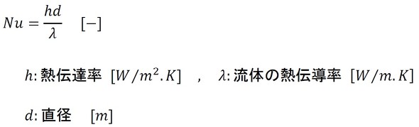 ここでの目標は、式4に登場する熱伝達率hを求めることです。そのために、ヌセルト数Nuが登場します。ヌセルト数は式8で定義されます。
