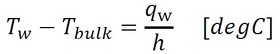 円管の場合、壁温の計算式は式11となります。パイプなどの内部流れでは、主流の温度の代わりに混合平均温度を用います。