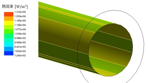 図5に温度分布を、図6に熱流束分布を示します。熱流束分布については、設定した境界条件がそのまま反映された結果となっています。