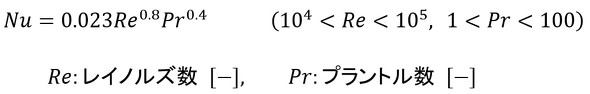 円管の乱流熱伝達率の見積もりには、実験式を用います。ここでは、代表的なものを2つ紹介します。式12はディタス・ベルター(Dittus-Boelter)の式です(参考文献[1])。