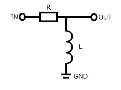INが入力でOUTが出力です。INに入力した信号をOUTの出力信号で観察します。それらを2現象のオシロスコープを使って、入力側の波形と出力側の波形を比較することでコイルによって引き起こされる微分現象を観測したいと思います。