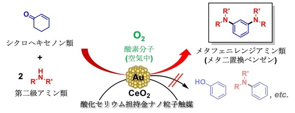 今回の研究では、担持金ナノ粒子触媒に特有の脱水素触媒作用を新たに発見。脱水条件で、酸化セリウム(CeO2)担体上に分散担持した不均一系触媒(Au/CeO2)を用いて、シクロヘキセノン類と第二級アミン類を基質とした脱水素芳香環形成反応を経るメタフェニレンジアミン類の選択合成に成功した。