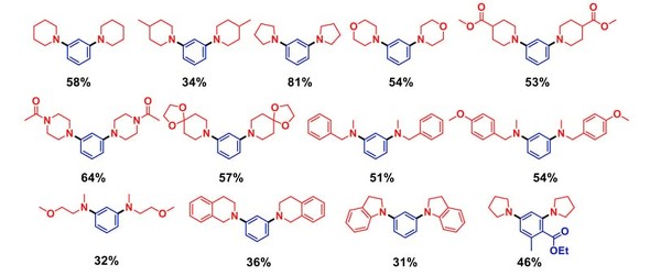 同触媒系は、さまざまなメタフェニレンジアミン類の選択合成に適用可能だ。今回の研究では、酸触媒や水の添加により、生成物選択性を変更できることも発見した。同様の触媒を使用し、N,N-二置換アニリン類やエナミノン類の選択合成も達成している。