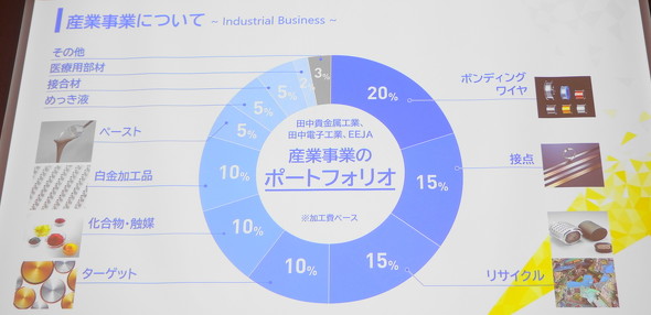 田中貴金属グループの産業事業を担当する田中貴金属工業は、金属加工製品や化学品、貴金属のリサイクル事業を幅広く展開している。現在は売上高全体のうち、ボンディングワイヤ事業が20%を、接点とリサイクルの事業がそれぞれ15%を、スパッタリングターゲット、化合物/触媒、白金加工品の事業がそれぞれ10%を、ペースト、めっき液、接合材の事業がそれぞれ5%を、その他が3%を占めている。