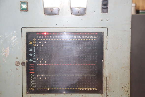 「これは、ピンを差し込む位置の組み合わせと、各所のリミットスイッチの信号電流によって機械を動かす仕組みになっている。当時は“プロコン”と呼ばれていた。ピンを差し込むだけでプログラムができ、何番のプログラムまで進んだかランプで分かる」(清水氏)