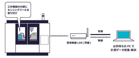 加速度センサーを採用したセンシングツールは、連続12時間使用可能なバッテリー内蔵のワイヤレス端末になっており、加工の邪魔にならず取り付けもマグネット式で簡単に工作機械内に設置できる。NC旋盤、マシニングセンタ、自動盤、複合加工機など機種やメーカー、年式を問わず、既存の機械にも取り付け可能だ。