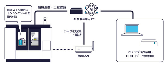 センシングツールが計測したデータをAI搭載の産業用PC(IPC)に収集/解析し、加工状態をリアルタイムでモニタリングする。また、工作機械と通信連携することで、工程ごとの加工状況をリアルタイムで測定し、異常を即座に検知/管理。さらに、取得データから切削工具の摩耗度をスコアリングし、基準値(閾値)を超えた場合にはアラートで知らせる。そして、全工程の加工状態を常時監視し、いつ、どの工程で、どの工具に異常が発生したのか原因特定(トレースバック)が可能になる。