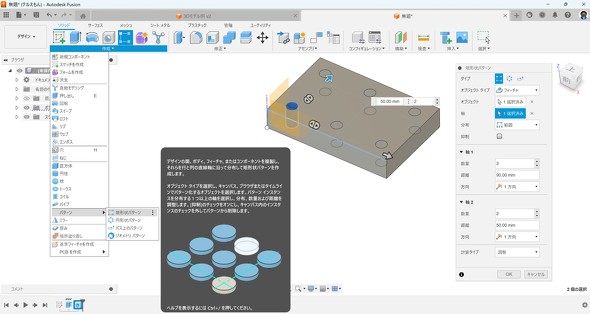 3D CADでは、フィーチャー(作業)やボディー(形状)をコピーできます。例えば、同じ直径の穴が複数ある場合、まず1つだけ作成し、それを指定した直線方向にコピーしたり、円形に回転コピーしたりすることが可能です。この機能を使えば、設計変更で穴の直径が変わった場合でも、コピー元の1つを修正するだけで、他の穴も連動して自動的に更新されます。また、穴の数を変更するのも簡単です。