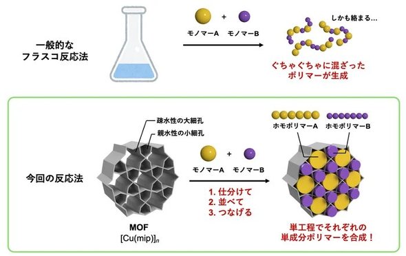 東京大学は、金属有機構造体(MOF)のナノ細孔を利用して、異なる種類のモノマーを自動で仕分けて、並べて、単独で重合させる新技術「マルチタスク型ポリマー合成法」を開発した。