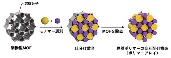 合成したホモポリマーは、MOFを分解して取り出すこともできる。MOFの細孔構造が鋳型の役割を果たし、それぞれのホモポリマーが直線状となって交互に整列する構造(交互配列構造)を形成することも分かった。さらに、MOF内の「つなぎ役」となる架橋分子を介してポリマー同士を架橋させることで、MOFを除去した後もアレイ構造を安定に保持できることも実証した。
