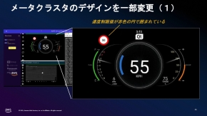 例えば、AWSは2025年1月開催の「CES 2025」において、要件管理への生成AI適用事例となるIVI(車載情報機器)を用いたデモを紹介している。このIVIは、クラウド上の仮想開発プラットフォームである「Amazon Graviton」上に構築されており、仮想ECUによって再現されている。ここで、メータークラスタ左上の速度制限値の表示の枠色を、通常の赤から、EVモデルの場合は緑に変更する例を見てみよう。
