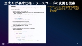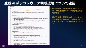 開発担当者はこの仕様変更の指示をテキストで入力する。従来は関連するエンジニアに仕様変更を連絡し関わる業務の割り当てを行った上で変更作業を進めていくことになる。しかし、AWSのデモでは、生成AIアシスタントである「Amazon Q」が仕様変更の指示を受けて、変更の前提となるソフトウェア構成環境について開発担当者に確認を求める。なお、Amazon Qは要求仕様書、詳細設計書、ソースコードの関係性をあらかじめ学習しているため、開発担当者が行うのはその内容が正しいかどうかの確認作業だけで済む。