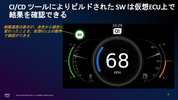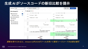 開発担当者が仕様変更の指示をテキストで入力すると「Amazon Q」に作業が割り当てられる(左)。Amazon Qは開発担当者に変更の前提となるソフトウェア構成環境を確認する(右)[クリックで拡大] 出所:AWSジャパン確認作業が完了すると、Amazon Qは要求仕様書の変更すべき部分と対応するソースコードの変更を提案する。この提案を受け入れれば、Amazon QはCI/CD(継続的インテグレーション/継続的デリバリー)ツールを用いて、変更した仕様に基づき生成した新たなソースコードと従来のソースコードの比較を提示する。ソースコード確認が終われば、CI/CDツールによってAmazon Graviton上に構築されたIVIに反映され、速度制限の枠色が変わったことを仮想ECU上の動作で確認できる。「従来は人手でやりとりしていた仕様変更に関わる要件管理のプロセスは数日かかることもあったが、生成AIであるAmazon Qに任せれば新たなソースコードを生成してECUに実装するまで数分で完了できる」(梶本氏)。