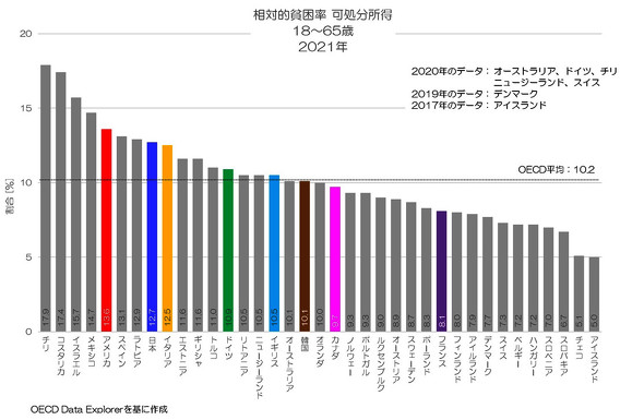図4が2021年の可処分所得における相対的貧困率の国際比較となります。