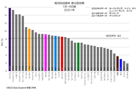 フランスが15.8%と非常に大きな水準となっています。再分配によって多くの人が貧困状態から脱していると解釈できますね。