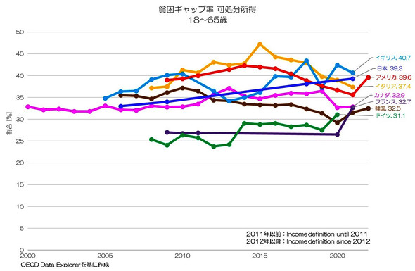 日本は39.3%でOECD32カ国中5番目、G7でも英国に次いで2番目とかなり高い水準となっています。日本は相対的貧困率が高いだけでなく、貧困ギャップ率も高い水準となっています。