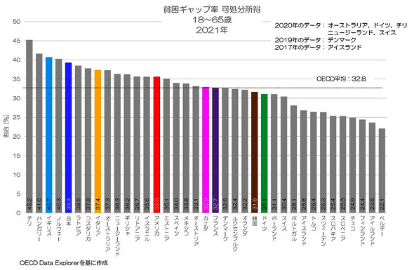 図7が2021年の貧困ギャップ率の国際比較です。再分配後の可処分所得における数値となります。