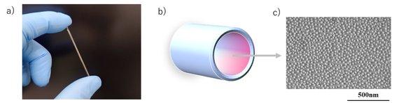 TANAKA未来研究所では、タンパク質を結晶化させるカウンターディフュージョン法で使用する、結晶発生能力の高いキャピラリーを開発。内径0.5mm、長さ5cmで、内壁には平均表面間距離40nmに整列した直径20nmのAuナノ粒子が配されている。