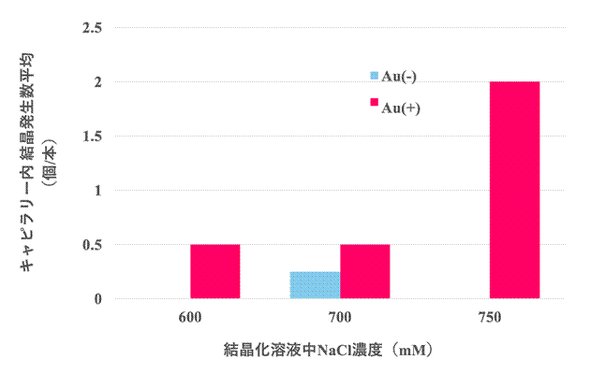 同ユニットは、ISSのコロンバス実験棟に約1カ月間設置。キャピラリー内のタンパク質溶液と外部の結晶化溶液を双方向に拡散させて結晶化させるカウンターディフュージョン法により、無重力環境下で結晶化を観察して地上に帰還した。実験の結果、Au(金)ナノ構造を形成したキャピラリー内では、Auナノ構造を形成していない場合に比べて結晶の発生数が多く、結晶化効率の向上が確認できた。