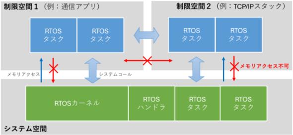 RTOSでは、Arm Cortex-A向けSOLID-OSで活用してきたMMU(メモリ管理ユニット)機能を拡張し、カーネルや他タスクのメモリ空間にアクセスできない「制限空間」を新設。ネットワーク通信機能などを分離して実行することで、外部からの攻撃リスクを低減できる。制限空間はメモリマップエディタから容易に設定可能で、既存のRTOSカーネルとも互換性を維持している。