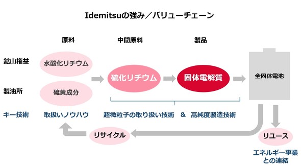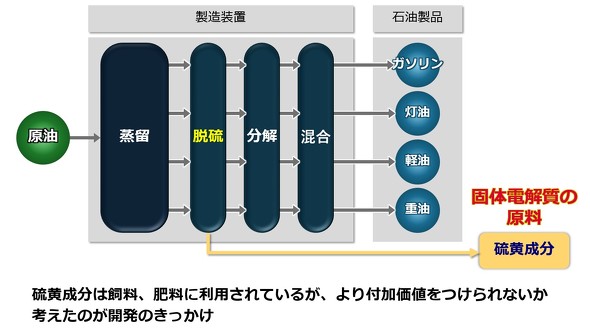 出光興産では、製油所から得られる硫黄成分を原料として、硫化リチウムを製造し、硫化物系固体電解質を生産する体制を構築している。これにより、品質管理された製品の安定供給を実現し、顧客である自動車メーカーからの高い信頼につなげている。