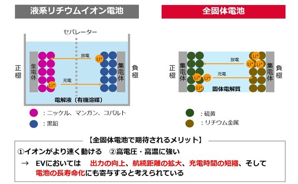 電解液を固体電解質に置き換えることで、より高性能な正極材、負極材を利用できる可能性があるため、電池の高容量化にも貢献できる。これにより、EVの走行距離を延ばすことが可能になる。