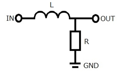 入力(IN)と出力(OUT)の間に直列にコイル(L)が入っています。そして抵抗(R)は出力と並列にグランドに落としています。